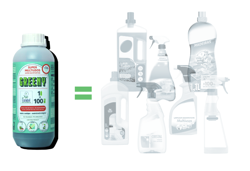 Uma única embalagem de 1 litro do detergente GREENY é capaz de gerar 100 embalagens de produto pronto a usar. Esta incrível capacidade de diluição significa que cada gota do nosso detergente conta, oferecendo uma limpeza profunda e eficaz a um custo extremamente reduzido, por apenas cêntimos após diluição.